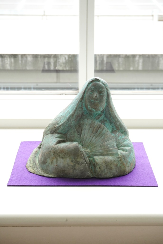 筑波山に着想を得て制作しました。筑波山の穏やかなかたちと御神徳を、上品でおっとりとした姫様が座しているようなかたちとして捉えています。豊かな自然を表現するために、ブロンズ表面に緑青を吹かせました。