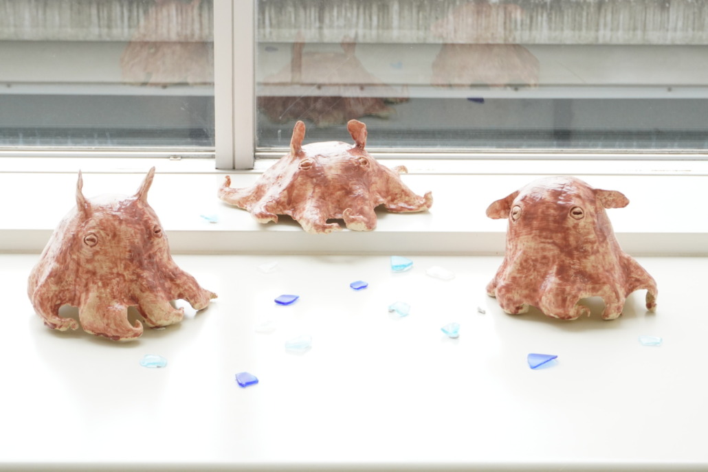 深海のアイドルと呼ばれるメンダコ。飼育が難しく、水族館などで展示されることは滅多にありませんが、深海でゆったりと泳ぐ姿は何とも言えないゆるさと魅力があります。そんなメンダコの活き活きした姿を表現したいと思い、今回は初挑戦の陶土と釉薬を用いて制作しました。深海という未知の世界から来た可愛くて不思議な案内人達です。深い闇に閉ざされた海。暗黒の中、微かに浮かび上がる無数の生命達の躍動を垣間見る旅にいざないます。