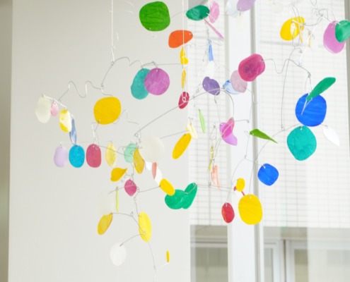 学生がそれぞれに考えてきた作品のアイデアには、生き物の形があり、その生き物に抽象的なイメージが付与されたものもあります。また、レリーフやモビールの特質を活かして、窓辺から差し込む光を作品に取り込もうとするアイデアもあります。