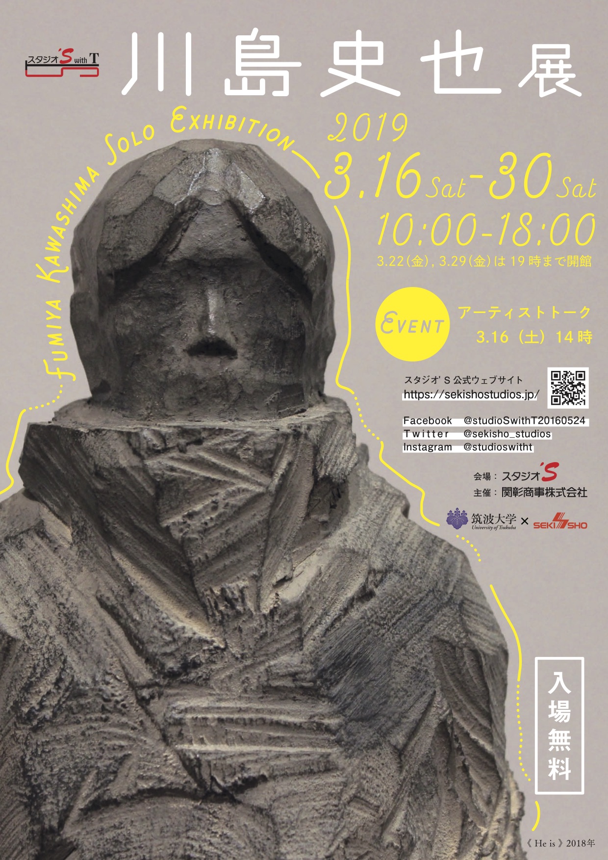 川島史也(博士後期3年)の個展として「川島史也展」が2019年3月16日(土)〜30日(土)までスタジオ’S(茨城県つくば市)にて開催されます。