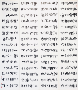 The term “Mou-zhuan” refers to a style of seal script used specifically for seal carving. Its character forms are square and well-balanced, imbued with the flavor of clerical script. In this piece, the structural principles of Mou-zhuan are employed to deconstruct the traditional configuration of seal script (Da-zhuan), while incorporating the light and lucid brush spirit characteristic of bamboo–slip writing. The composition features vertically open and horizontally dense spacing, striving to convey the diverse expressive qualities and aesthetic appeal of the ancient seal script tradition.