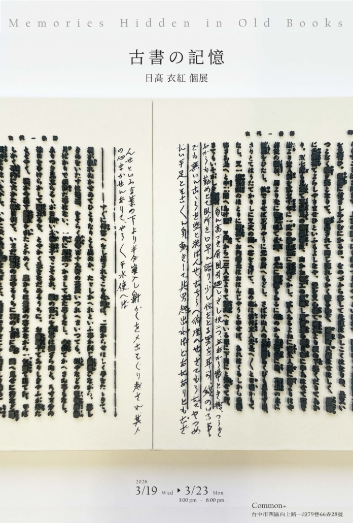 2026年3月19日~23日に、日髙衣紅個展「古書の記憶」が 、台中のCommon +ギャラリーにて、開催されます。