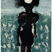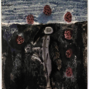 中村忠二は、様々な職を経ながら日本美術学校で学び、展覧会や個展で水彩画や油絵を発表する一方、水墨画さえ手がけた。1958年以降はモノタイプ(ガラスや金属に描画して紙に転写する版画技法)に専念し、独特の絵画世界を創り出した。本作はそのモノタイプによる中村の初期作品にあたる。バッタを立たせたようなユーモラスな人物像、また転写の際に偶然できる絵具のにじみやかすれも手伝って、画面には不思議な生命感がかもし出されている。なお作品裏面には「皇太子御成婚について」という書き込みがあり着想源のひとつを示唆している。