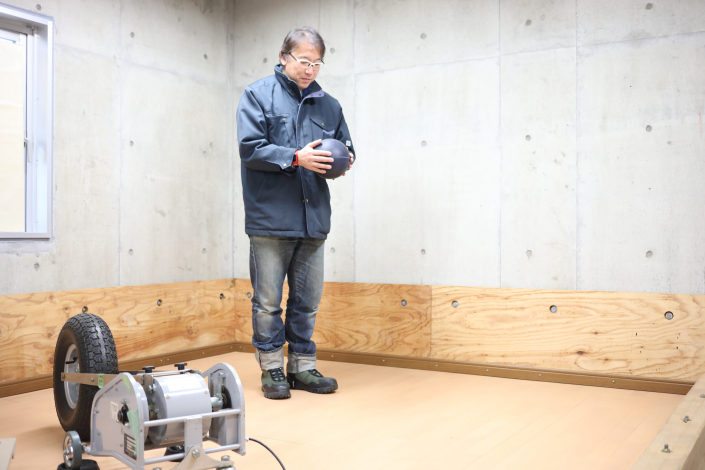 集合住宅等における音環境に対するクレームやトラブルが多く、解決すべき課題があるのが現状です。さらには、木材利用の促進という国の施策の中、新しい建築物の工法(CLTパネル工法など)が誕生し、一般的に性能が劣る木造建築物の音環境性能の向上など新たな課題もあります。また、音環境性能の測定・評価方法の標準化(JIS化)に対し、ISO規格との対応を見据えた基準類の見直しも行うべき課題の一つといえます。建築物内の騒音については、居住者や使用者の日常的な問題と捉えることができ、その問題点の解決のための検討、音や振動等の物理現象解明に関する研究を行っています。社会貢献が可能となる研究成果を得るために、建築音響分野だけでなく、他の分野も意識・連携し、最終的には音環境性能からみた快適住環境の提供を目指します。