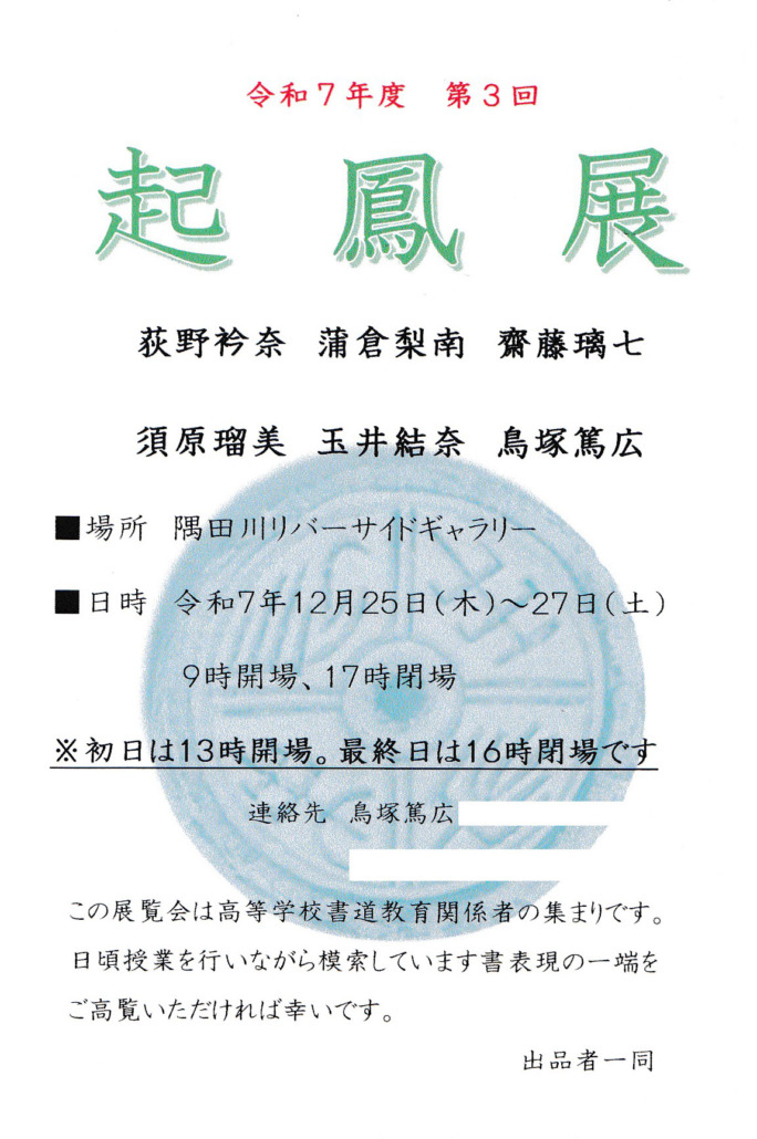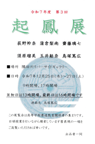 修了生・鳥塚篤広さん、卒業生・蒲倉梨南さんが参加する書のグループ展が、下記の通り開催されます。