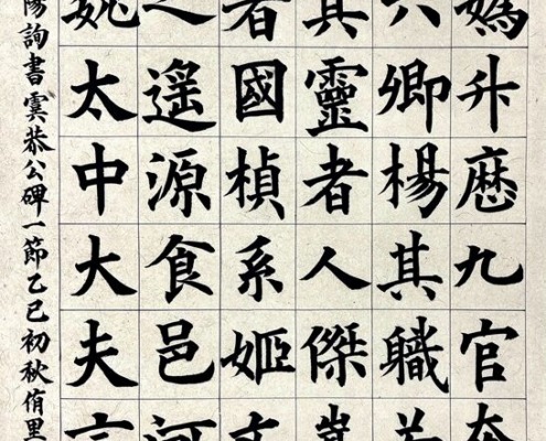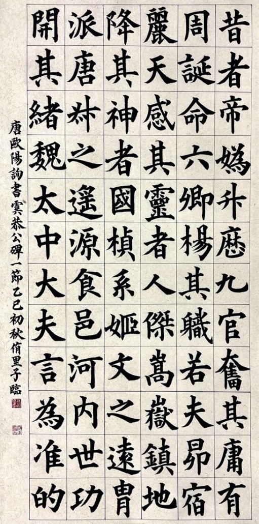 本碑は、初唐の名臣・温彦博(574~637)を顕彰する墓碑であり、欧陽詢(557~641)が八十一歳のときに書した晩年を代表する楷書の名碑です。作品にするにあたり、残存文字から句切れのよい文を抜粋し臨書しました。