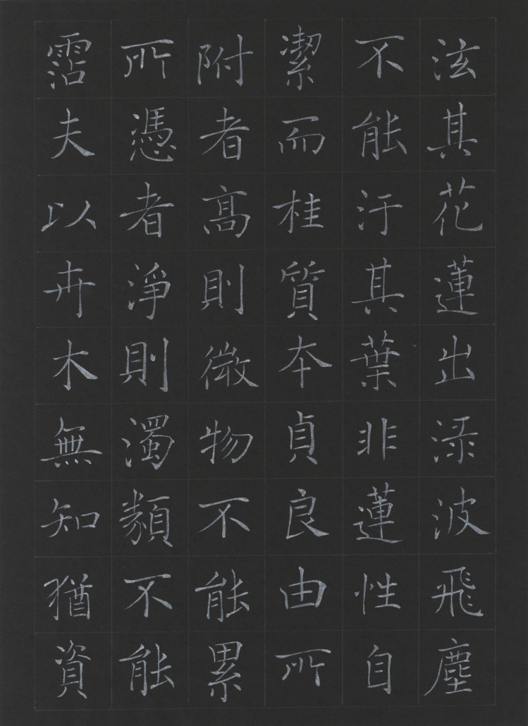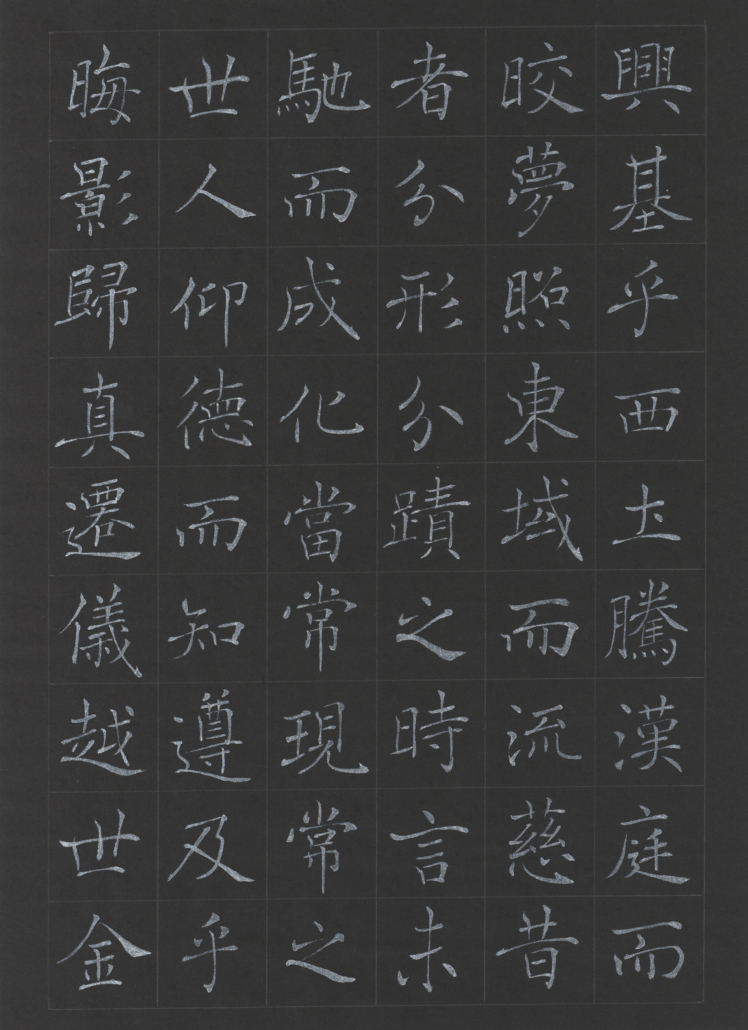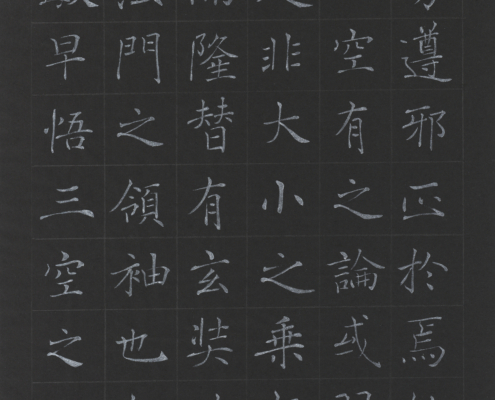 この作品は行書のようなしなやかさと張りの強さ、抑揚に富んだ用筆が特徴的です。今回の作品は紺紙に銀泥で臨書したため肥痩や強弱の変化を表現するのが難しかったですが、それらの点を意識して臨書するよう努めました。少しでも古典の魅力が伝われば幸いです。