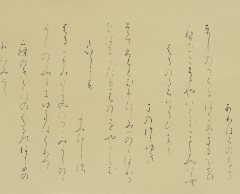 五島美術館蔵の巻一巻頭3首断簡とは別に、4番歌が手鑑「浜千鳥」に所収されています。 当然ながら当初は連続しており、これで約53cmの高野切の料紙一紙分であったとみてよく、その再現を図りました。 今後も復元的な臨書に努めたいと思います。