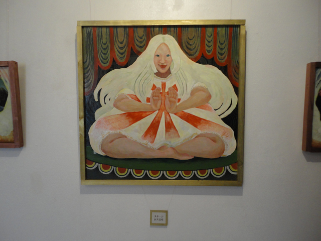 まず、そのタイトルセンスの良さに私は魅かれた。作品自体の魅力はもちろんだが、タイトル次第で作品の印象自体が大きく変わることもある。例えば、不思議ないでたちの女性が暗幕から何か呼びかけるようなポーズで顔を出している作品に「ステージ:やっほー」というタイトル。「やっほー」なんて字面だけでも愉快な気分にならないだろうか。他にも、日章旗のような太陽を抱えて座る女性を描いた「お天道様」。鱗状の衣装が特徴的な「魚」など、単純でありながらも作品のもつ楽しい雰囲気をより引き立たせるような言葉のチョイスは見事である。一枚の絵を一つのステージに見立てた展示室は薄暗く、ともすればお堅い雰囲気になりかねないが、作者のポジティヴなセンスが全体的に上手く作用することで場の空気まで変えていたように思う。また、作品自体も工夫が凝らされていて面白い。例えば、テカテカにコーティングされた画面や色面構成のような塗り方。いわゆる油絵のイメージを裏切るような表現技法を使いながらも、油絵にしか出せない物質感を持たせることで画面全体が不思議な印象を生み出している。また、各作品をステージに見立てることで展示全体が一つの演劇を作り出しているようにも見えた。