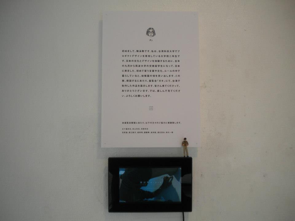 私は、台湾科技大学で、プロダクトデザインを専攻している大学院二年生です。日本の文化とデザインを体験するために、去年の九月から、筑波大学の交換留学生になって、日本に来ました。初めて習う言葉や文化、ルールの中で暮らしていると、幼稚園の頃を思い出します。この春、帰国するにあたり、展覧会「ガキ」にて、台湾で制作した作品を展示します。是非見に来てください。よろしくお願いします。