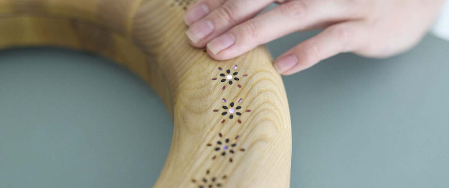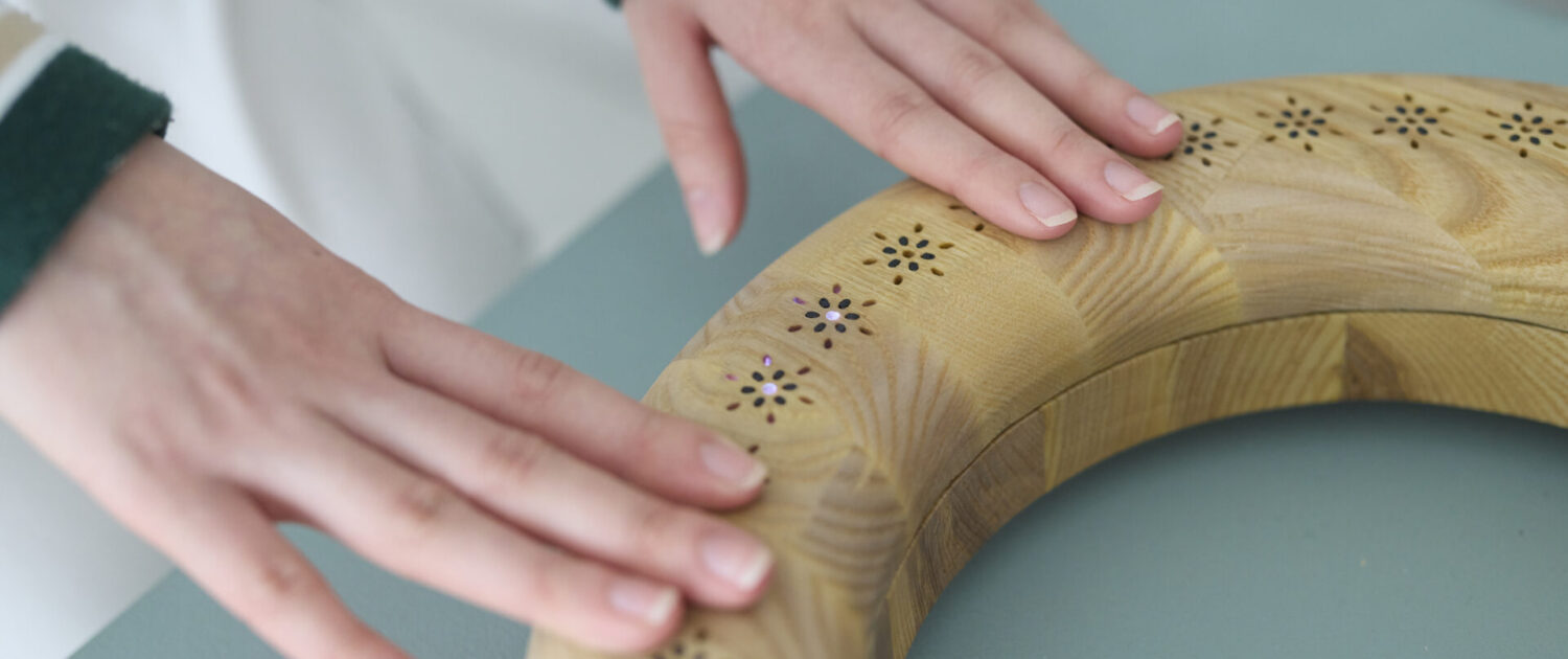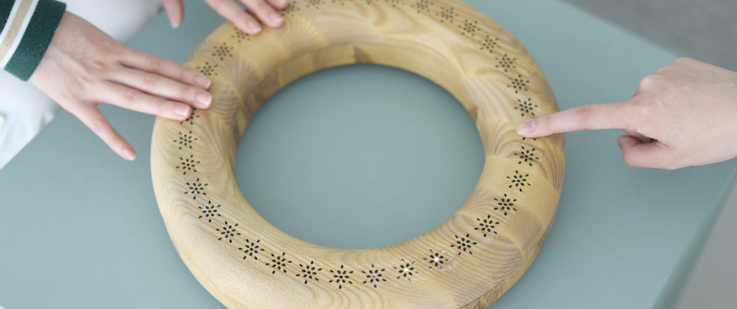 木製の輪の中を光と振動が静かにめぐるインタラクティブなプロダクトです。 光は輪の中を時計回りにまわり続け、 内蔵された振動モジュールがその軌跡に沿ってやさしく触覚を伝えます。輪の表面に指をそっと置くと、その場所で光と振動は進行方向を変え、逆回転をはじめます。ふたつの指で異なる場所を押さえておけば、光と振動はそのあいだを振り子のように往復し続け、まるで人とプロダクトが共に呼吸しているような感覚を生み出します。 どこに触れるか、いつ触れるか、どれくらい触れるか。 そのわずかな違いが、空間全体のリズムを変えていきます。「ふれると、もどる」。それは、ただ触れるだけで、 世界の流れがやさしく変わる体験です。