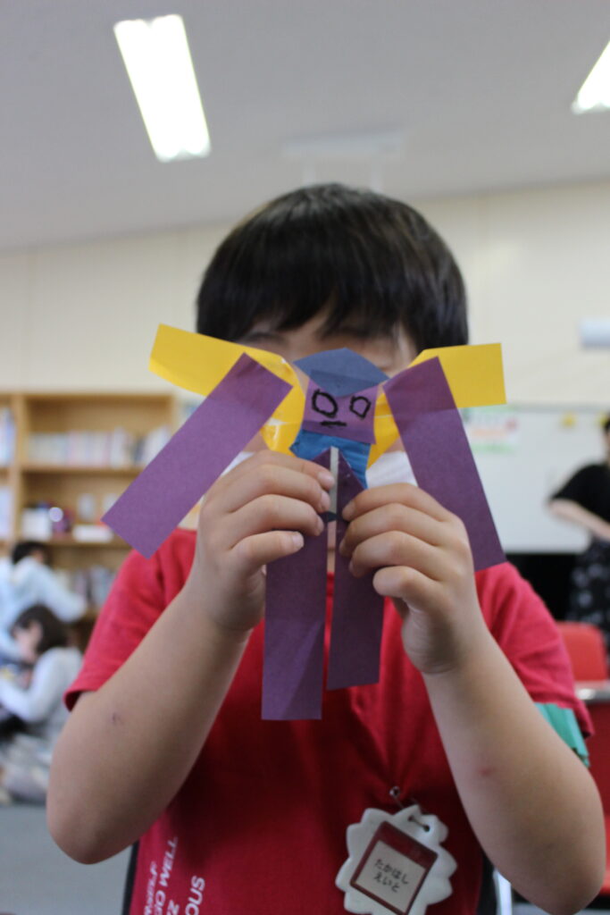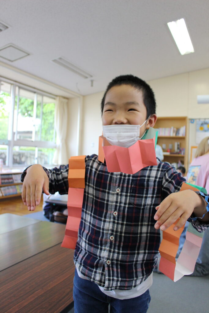 5月_ギザギザおりがみ 2022年度、初の子どもとの対面ワークショップ!進級して顔なじみの2,3年生もいればピカピカの1年生もいました! 今月のタイトルボード 初司会で緊張中 おねえさんの説明をよ~く聞いています ギザギザの折り紙で各々の作品ができました~