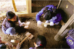 たきは単調な作業で重労働にみえるが、やってみると子供たちがこぞって参加し、飽きることなくたたき続ける姿が印象的であった。土の持つ不思議な