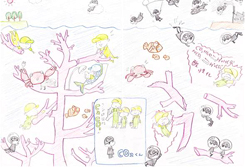 人類の化石燃料の使用などによって大気中の二酸化炭素濃度は年々増加している。その一部は海洋によって吸収され、その結果海水中の水素イオン(H+)が増加して海洋の酸性化がおこる。海洋酸性化による水素イオンの増加によって炭酸カルシウム(CaCO3)生成に必要な炭酸イオン(CO32-)が減少し、サンゴなど炭酸カルシウムの形成を行う生物やそれを含む生態系は大きな影響を受けると考えられている。以上を踏まえ、海洋酸性化のメカニズムとそれが海洋生物に対して与える影響について、学生を含む一般読者に分かりやすく伝えるイラストを描きなさい。