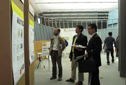 日本科学未来館1Fの「サイエンスアゴラ2011のロゴタイプ・ポスター・キャラクターデザイン」発表ポスター前。ポスター・キャラクターデザインが採用された長田さん(左)とロゴタイプデザインが採用された堀内さん(中央)。