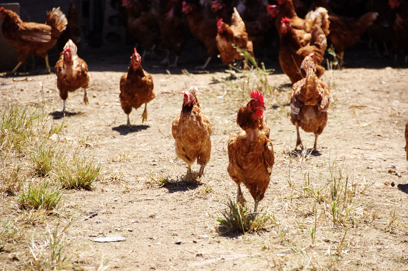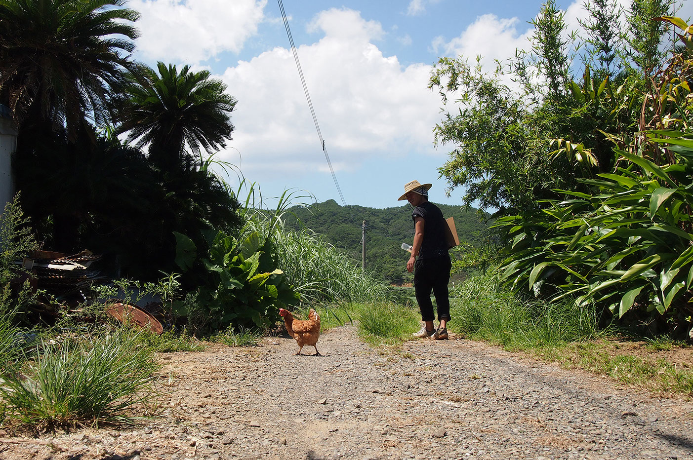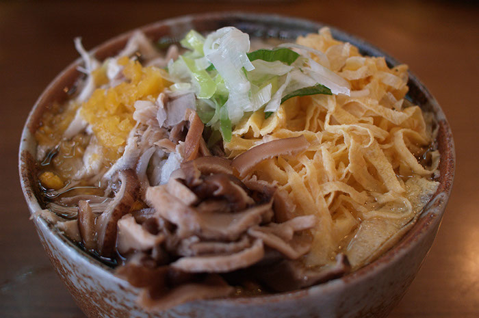 鶏肉と金糸卵、しいたけの上に、ネギや島みかんなど薬味をのせて。熱々の出し汁をかけて食べるのです。
