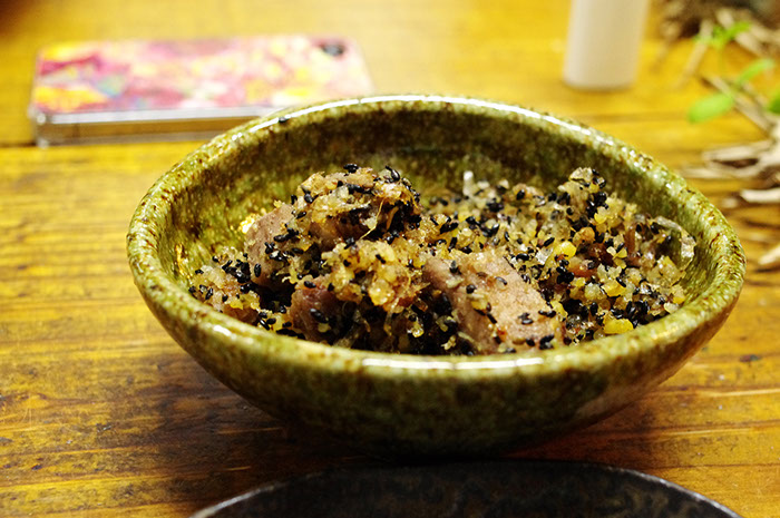 ばら肉のブロック、奄美の高倉味噌に、ザラメ、おかか、黒ゴマ。甘めのブタミソで、ご飯が進みます。